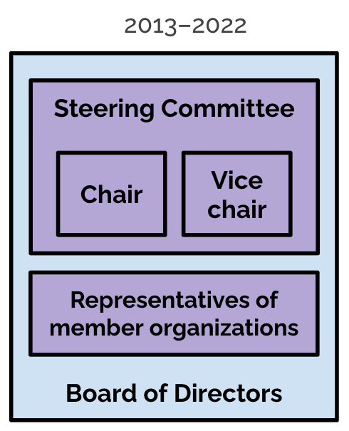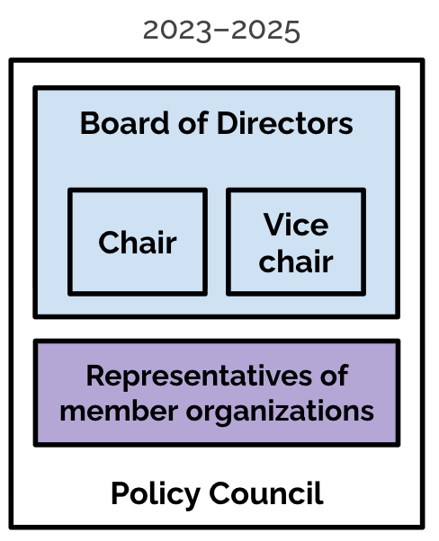 In early 2023, the organization was restructured to simplify governance and avoid issues with having too many directors on the board. In the new structure, the existing Steering Committee was replaced by a smaller Board of Directors (3–5 representatives), while the voting body of representatives became the Policy Council. From 2023 to early 2024, Oskar van Rest of Oracle served as the chair of the organization.